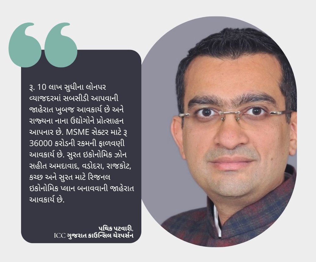 - રૂ. 10 લાખ સુધીના લોનપર વ્યાજદરમાં સબસીડી આપવાની જાહેરાત ખુબજ આવકાર્ય છે અને રાજ્યના નાના ઉદ્યોગોને પ્રોત્સાહન આપનાર છે.